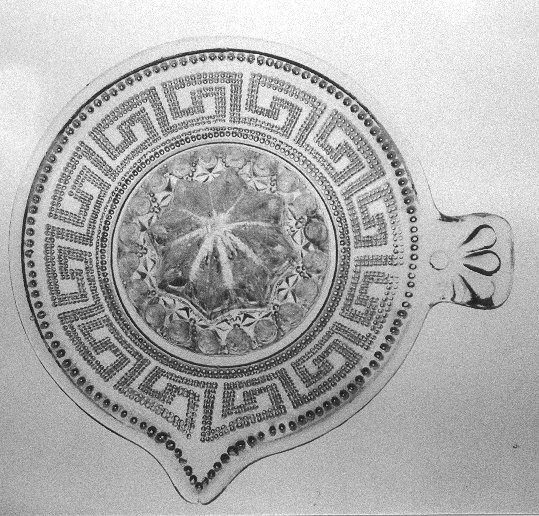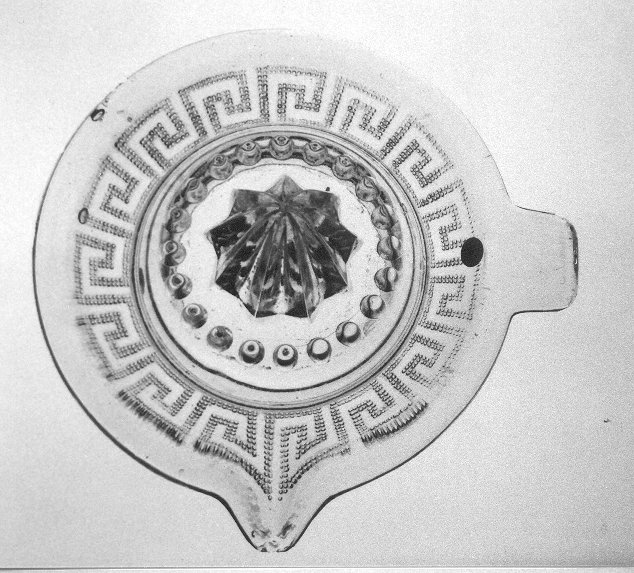 - Dekor: Zwischen einem Fries aus Doppel-Punkten und einem Perlfries (oben) linkslaufendes Mäanderband. Im Boden
